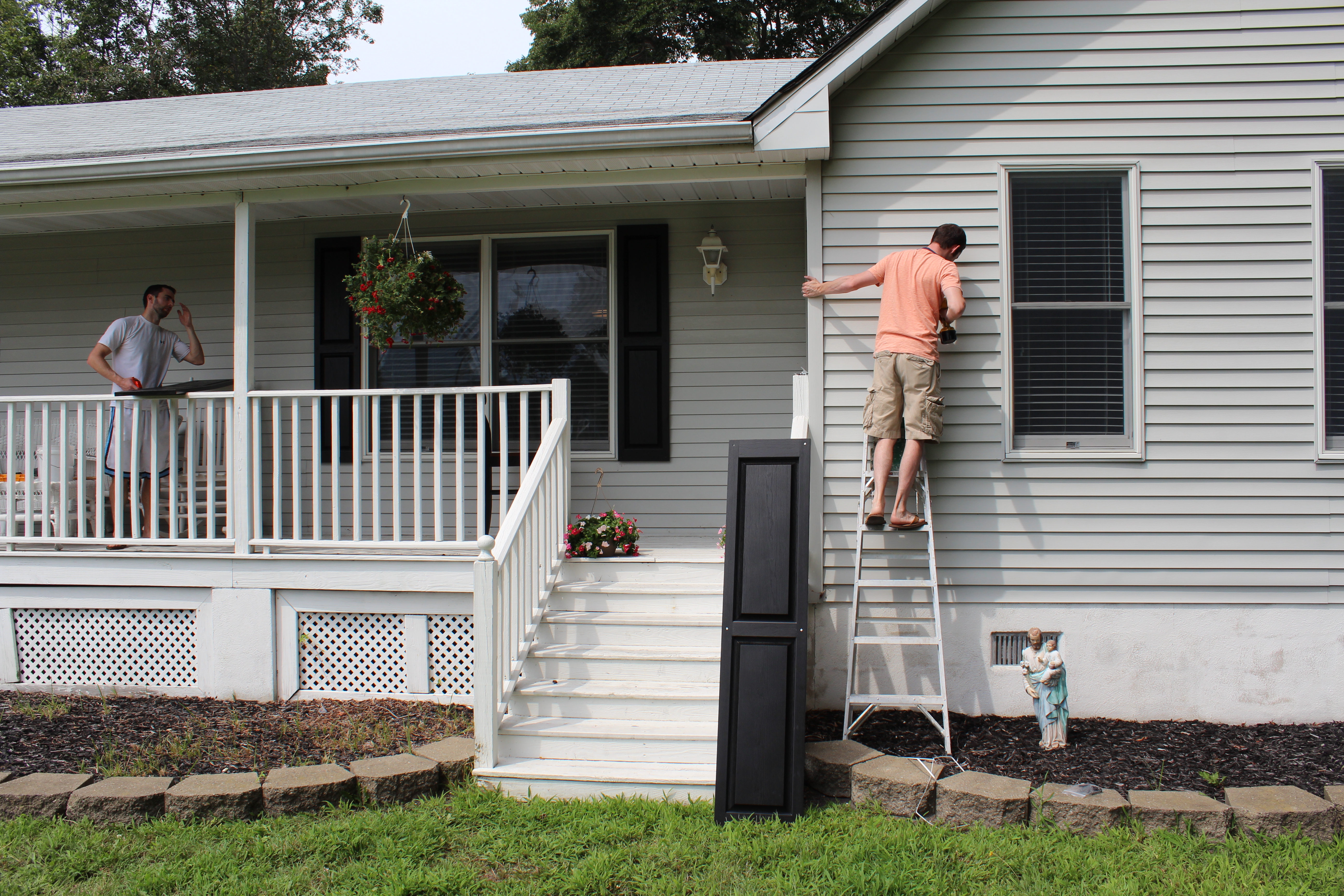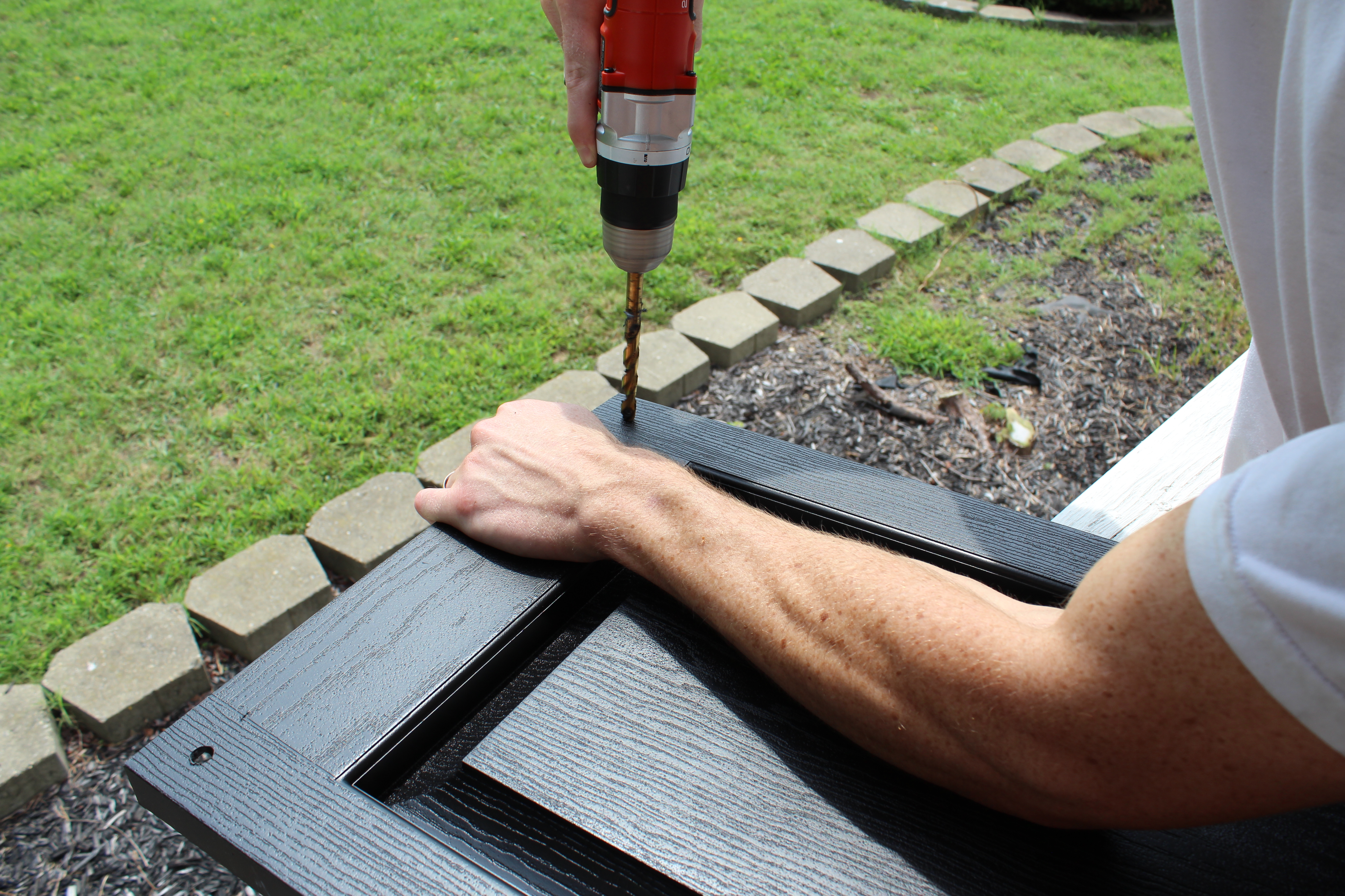 The shutter then gets held up against the house near the window and you can use a pencil to mark the siding where the holes are located. Then the holes were drilled into the house with a 1/4″ diameter drill bit. Make sure the bit is sharp or it’s going to take forever. It’s probably a good idea to not do this in flip flops and to move any St. Joseph’s statues before you begin.