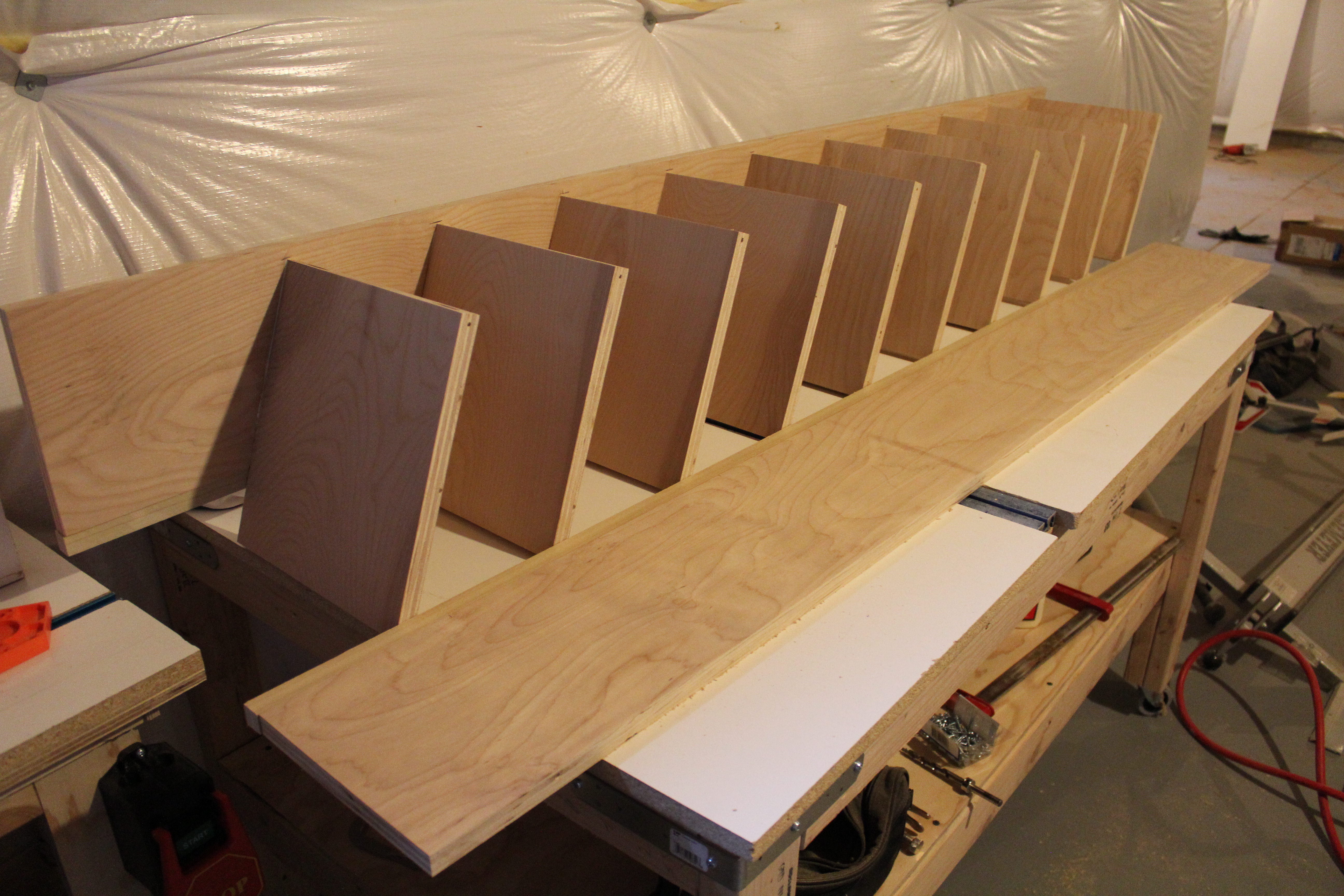 This was the most monotonous part of the job so far. We’re adding ten shelves, with two pocket holes each. That’s a good 30 minutes of clamping, drilling and un-clamping.
