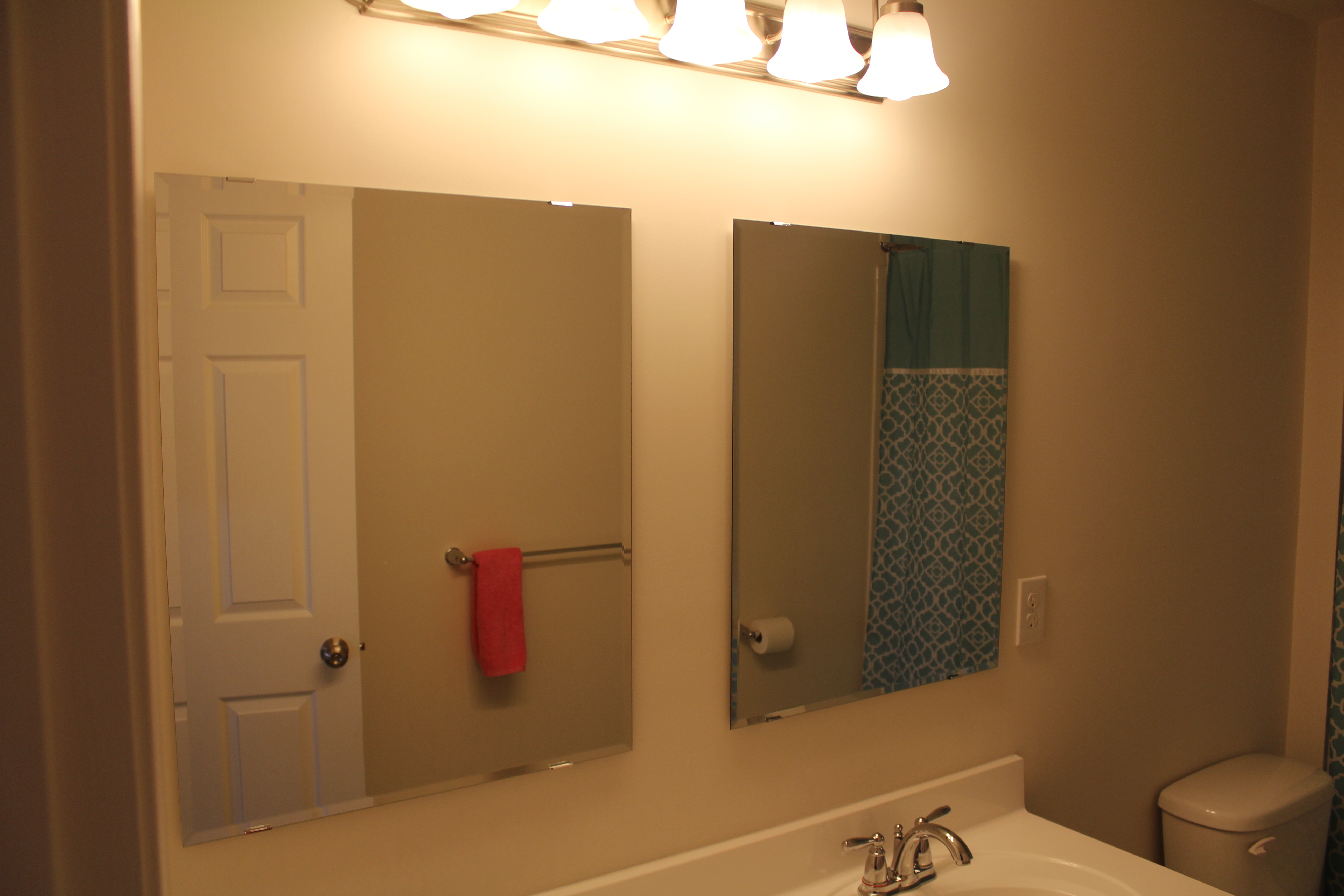 Actually, a while ago, we showed the bathroom as a sneak peak in our 5 Tips for New Home Builders. When we built, we opted to skip the large builder grade mirror and instead asked the builder not to install anything at all. They were totally fine with that idea. After all, it was less work for them. We installed a couple Ikea Kolja mirrors instead for a more personalized look.
