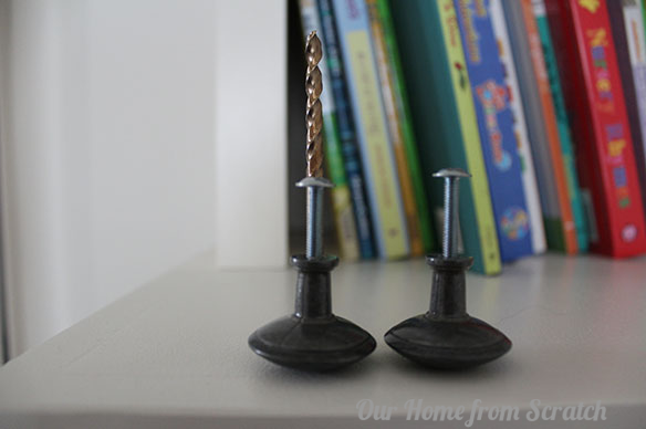 Instead of going out and buying some nice bling for this cabinet, we decided to just reuse the drawer pulls from our daughter’s Ikea Hemnes dresser. The knobs are dark, simple and look pretty good with the white cabinets. Since the cabinets don’t have any holes drilled for door pulls yet, I whipped up a simple, homemade jig for installing cabinet door pulls.