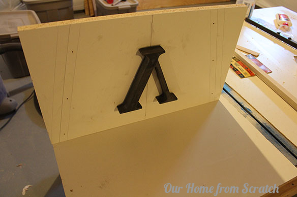 To start, you cut all the melamine pieces for the form. The form pieces are listed in the article. I added the V letter to the board that’s the front of the planter. I calked it to the melamine and then caulked around the perimeter of the letter.
